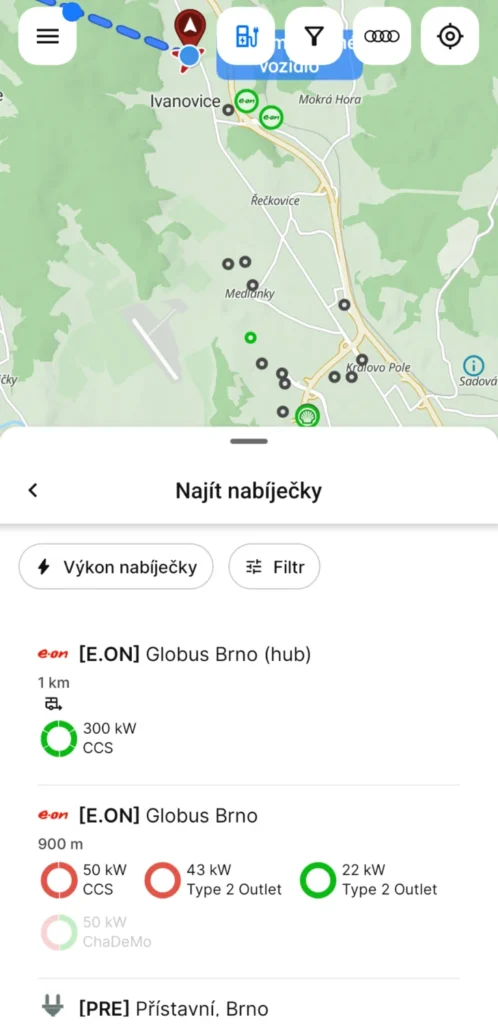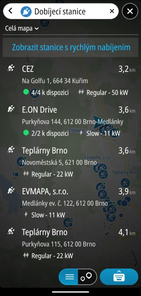 Databáze nabíjecích stanic je obsáhlá jako u TomTomu, obsahuje i dost informací o nabíjení včetně počtu nabíječek, výkonu nebo konektorech (podle toho je můžete filtrovat), ale na rozdíl od TomTomu zobrazuje obsazenost pouze u některých.