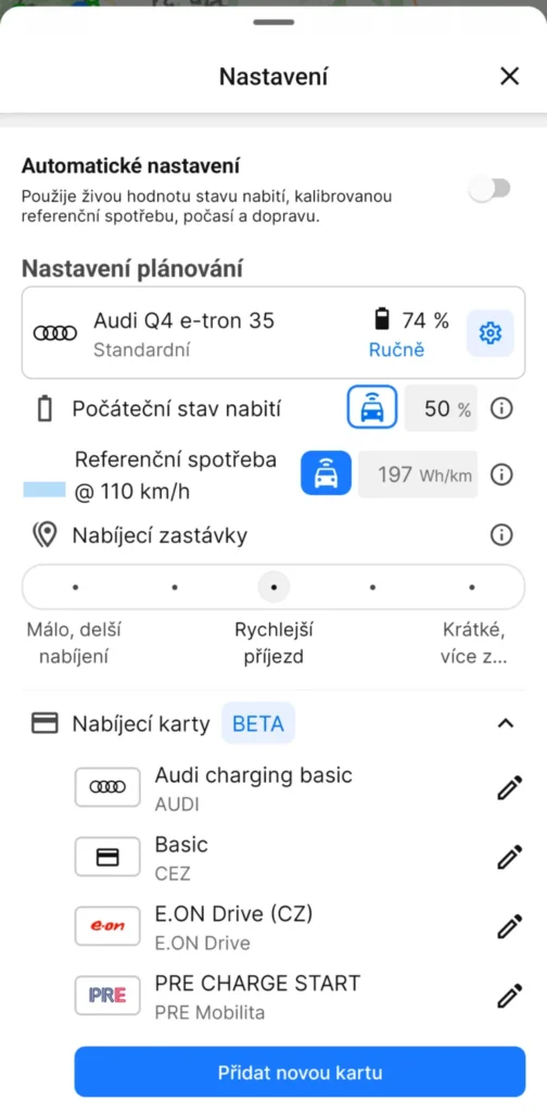 Plánovat nabíjecí zastávky jako AmiGO neumí, ale zase umí to, co mi chybělo u AmiGO: vybrat si sítě, u kterých mám účet a chci nabíjet. Bohužel to není řešené úplně šťastně. Nabíjecí stanice ze sítí, které si nevyberete, to prostě z vyhledávání úplně odfiltruje, ale to nechci. Nabíjet bez zákaznického účtu už dnes můžete skoro u kterékoliv stanice a občas se může hodit i ta ze sítě, u které běžně nenabíjíte. Po navigaci bych chtěl, aby ceny, které u jednotlivých sítí mám, reflektovala v plánování nabíjení, aby mě nedovedla k nabíječce, kde zaplatím 20 Kč/kWh, když o dva kilometry dál je taková, kde bych nabil za polovinu.