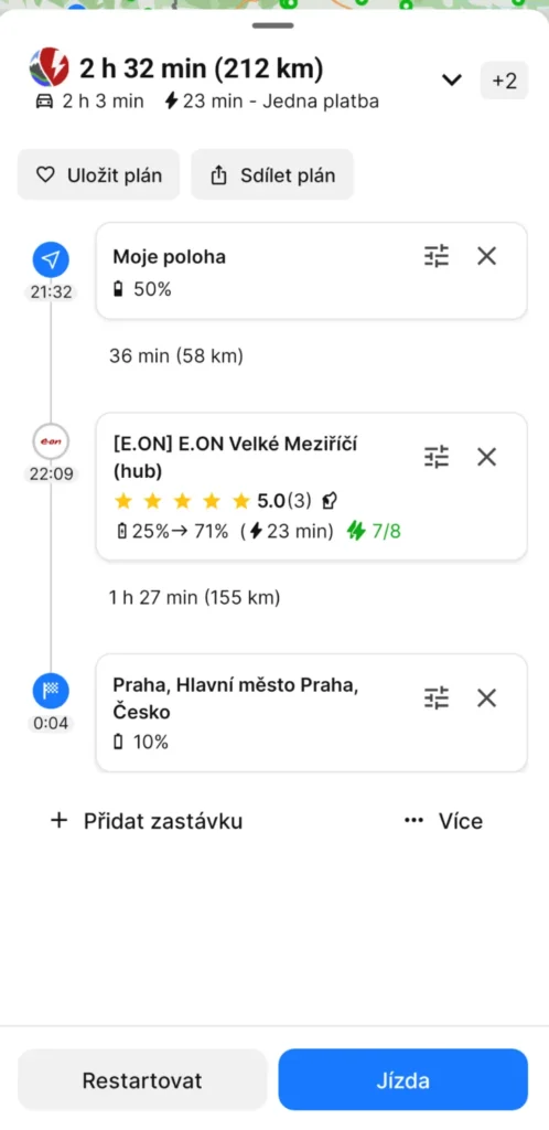 Do toho si ještě nastavíte, jaké konektory vaše auto podporuje, a před jízdou ještě počáteční úroveň nabití. A na základě toho všeho opravdu spolehlivě dělá to, co Sygic slibuje, ale reálně mu nefunguje: naplánuje trasu včetně zastávek pro nabíjení. O každé zastávce vám dá informaci, kdo ji provozuje, kolik procent baterie tam máte nabít a jak dlouho vám to bude odhadem trvat.