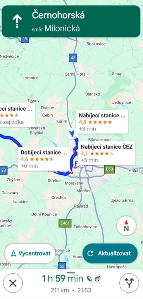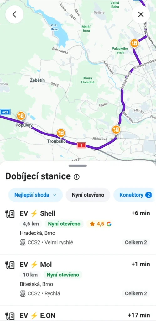 Google Maps neumí plánovat nabíjecí zastávky. Umí nabíjecí stanice vyhledávat a zobrazovat po cestě. V nastavení si vyberete jako typ motoru elektro a ze seznamu konektorů vyberete ty, které vaše auto podporuje. Podle toho dokáže filtrovat stanice, které vám ve vyhledávání zobrazí. Databáze nabíjecích stanic se zdá hodně podobná tomu, co má Waze. Je dost dobře možné, že ji sdílí a jedná se o stejný zdroj. Je aktuální a informace o nabíjecích stanicích jsou přesné. Tím ale podpora Google Maps pro elektroauta začíná a také končí.