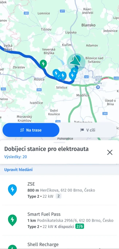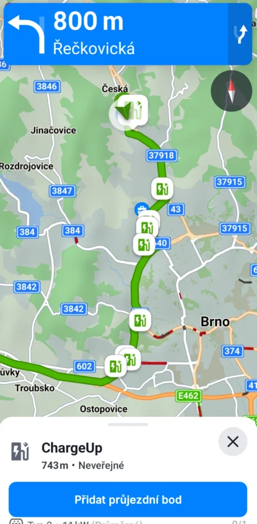 Co se týče podpory elektroaut, tak je na tom podobně jako TomTom GO. Můžete nabíjecí stanice vyhledávat v okolí, můžete je vyhledávat po trase. Na rozdíl od GO vám nezobrazuje, když se k některé blížíte. Navíc vyhledávání po trase má asi hodně vysoký práh, protože třeba populární nabíjecí stanici ve Vystrkově, která je asi kilometr od dálnice, vám na trase Brno-Praha nezobrazí.