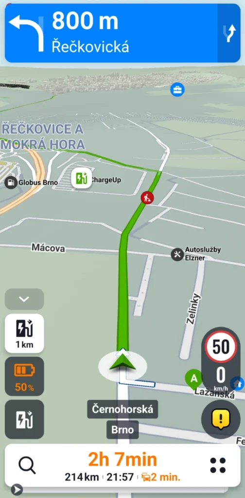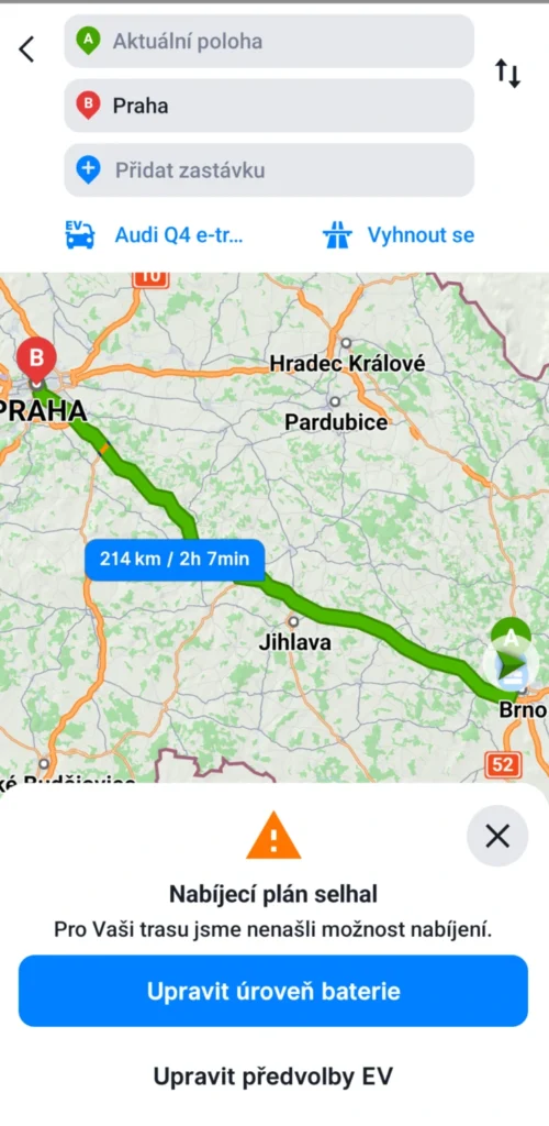 Sygic dokáže v databázi vyhledat vaše elektroauto a doplnit kapacitu baterie a spotřebu. Na začátku jízdy vyplníte aktuální úroveň nabití baterie a Sygic by vám měl na základě daných vstupů navrhnout trasu včetně nabíjení. Bohužel v praxi to spíš nefunguje, než funguje. I když dám maximální rozsah nabíjecích výkonů a typů konektorů, většinou dostanu odpověď „Nabíjecí plán selhal. Pro Vaši trasu jsme nenašli možnost nabíjení“. Přitom vím, že po trase jsou desítky možností nabíjení.