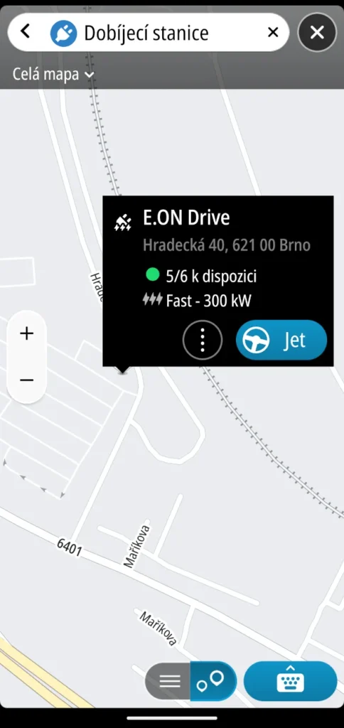 Když si v profilu auta nastavíte elektrický motor a konektory, které vaše auto podporuje, umožní vám TomTom GO vyhledávat nabíjecí stanice v okolí a zobrazovat vám je po cestě místo stanic čerpacích. A to je vlastně vše. Na rozdíl od Sygicu jsou ale informace o nabíječkách alespoň aktuální a správné. Např. onu několik měsíců starou nabíjecí stanici u Globusu zobrazuje a uvede u ní také správný výkon a dostupnost.