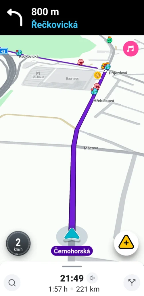 Ve srovnání nemůžu vynechat Waze, který je u nás asi nejpopulárnější autonavigací. Osobně jsem mu nikdy nepřišel úplně na chuť. Ať už kvůli tomu, že mi navigování nikdy nepřišlo tak přehledné jako u Sygicu, nebo kvůli tomu, že jej provozuje reklamní společnost, která sesbíraná data používá k cílení reklamy, nebo i kvůli takovému detailu, jako jsou ty infantilní ikony.